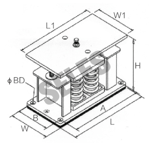 AT3型彈簧減振器是由高強度鋁合金外殼、彈簧及橡膠防滑墊組成。該產品為開敞式結構,具有靈活性大、穩定性好、固有頻率低、減振效果顯著等優點,安裝時可直接安放在設備底下,若動力設備撓力較大,可先調節重心,并將減振器底座固定孔用螺栓固定地基。