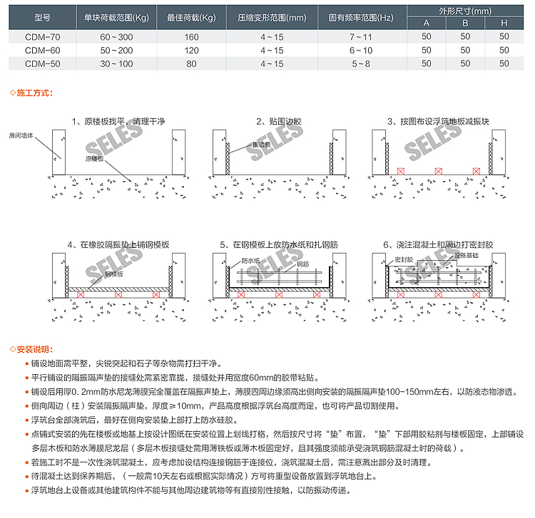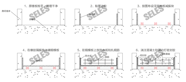 ● 側(cè)向周邊(柱)安裝隔振隔聲墊,厚度≥10mm,產(chǎn)品高度根據(jù)浮筑臺高度而定,也可將產(chǎn)品切割使用。